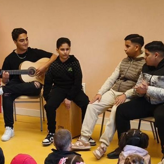 En estas imágenes se muestra la colaboración de AVNEC como entidad interlocutora entre el I.E.S. Font de Sant Lluís y el Colegio Les Arts, donde acudieron alumnos del centro superior a una demostración de guitarra, palmas, y cajón, en el día de la música.