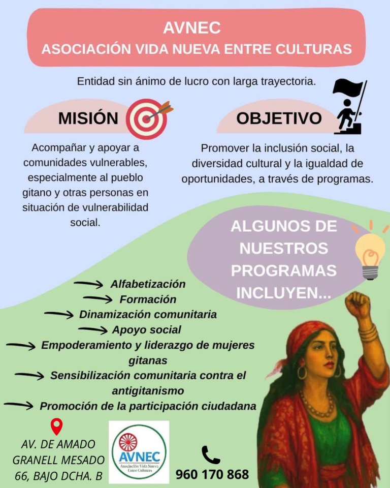 Somos una entidad social con sede en el barrio de Na Rovella (Valencia). Nació en 2008 con el objetivo de acompañar a colectivos en situación de vulnerabilidad, especialmente a la población gitana y migrante.