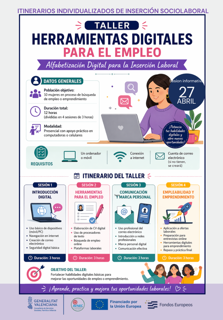 Acción formativa centrada en la adquisición de competencias digitales básicas, imprescindibles en la sociedad actual y en el acceso al empleo. Se trabajan herramientas informáticas, uso de internet de forma segura, correo electrónico, trámites online, plataformas de empleo, elaboración de currículum digital y manejo básico de aplicaciones útiles para la vida cotidiana y laboral.
