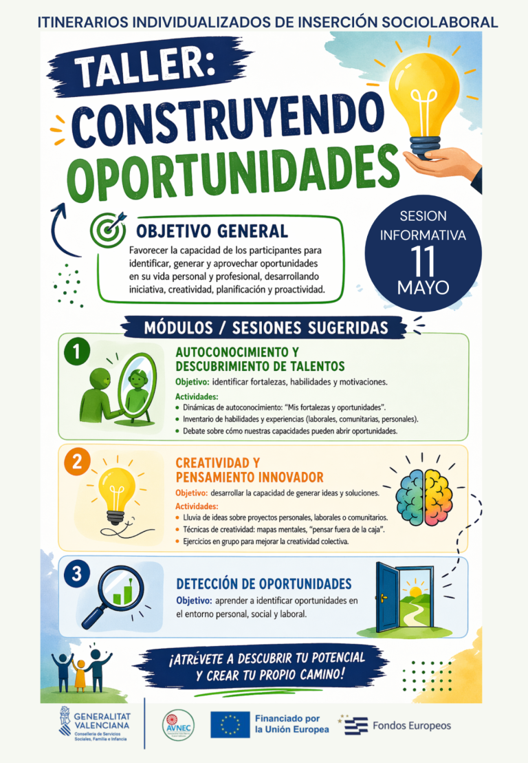 Espacio de reflexión, motivación y crecimiento personal centrado en el autoconocimiento, la identificación de capacidades y la detección de oportunidades de desarrollo personal y profesional. Se trabaja la autoestima, la definición de objetivos, la identificación de intereses vocacionales, la toma de decisiones, la planificación de metas y la exploración de itinerarios de inserción ajustados al perfil de cada participante.